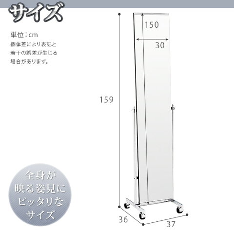 商品詳細 サイズ 全体:幅37×奥行36×高さ159cm 鏡部分:幅30×高さ150cm(3mm厚) 仕様 材質:ガラス/スチール 飛散防止処理加工 ※お客様組立商品です。